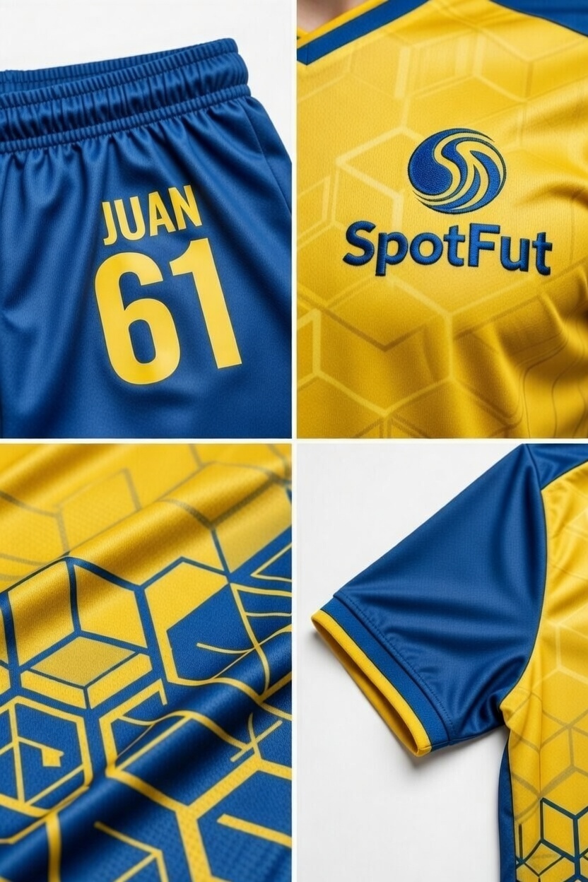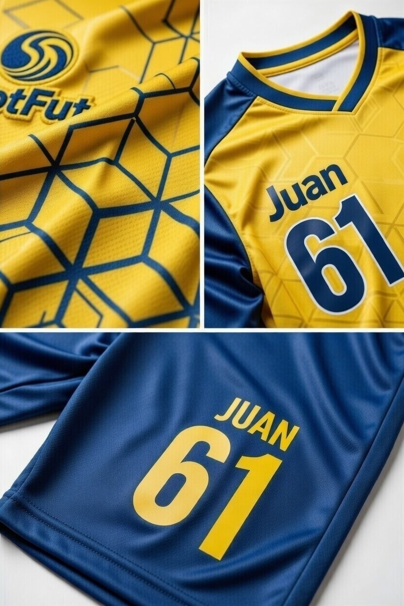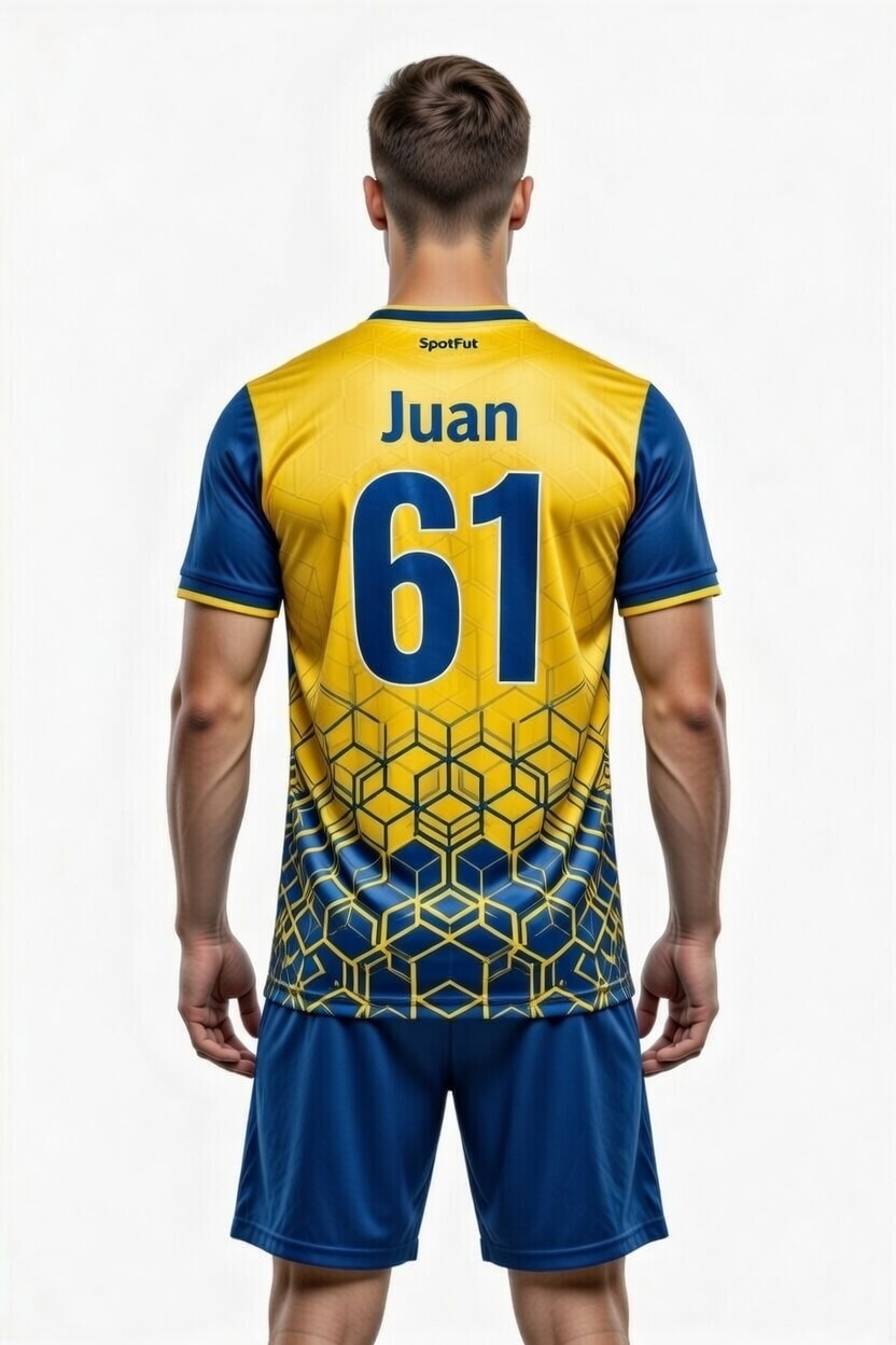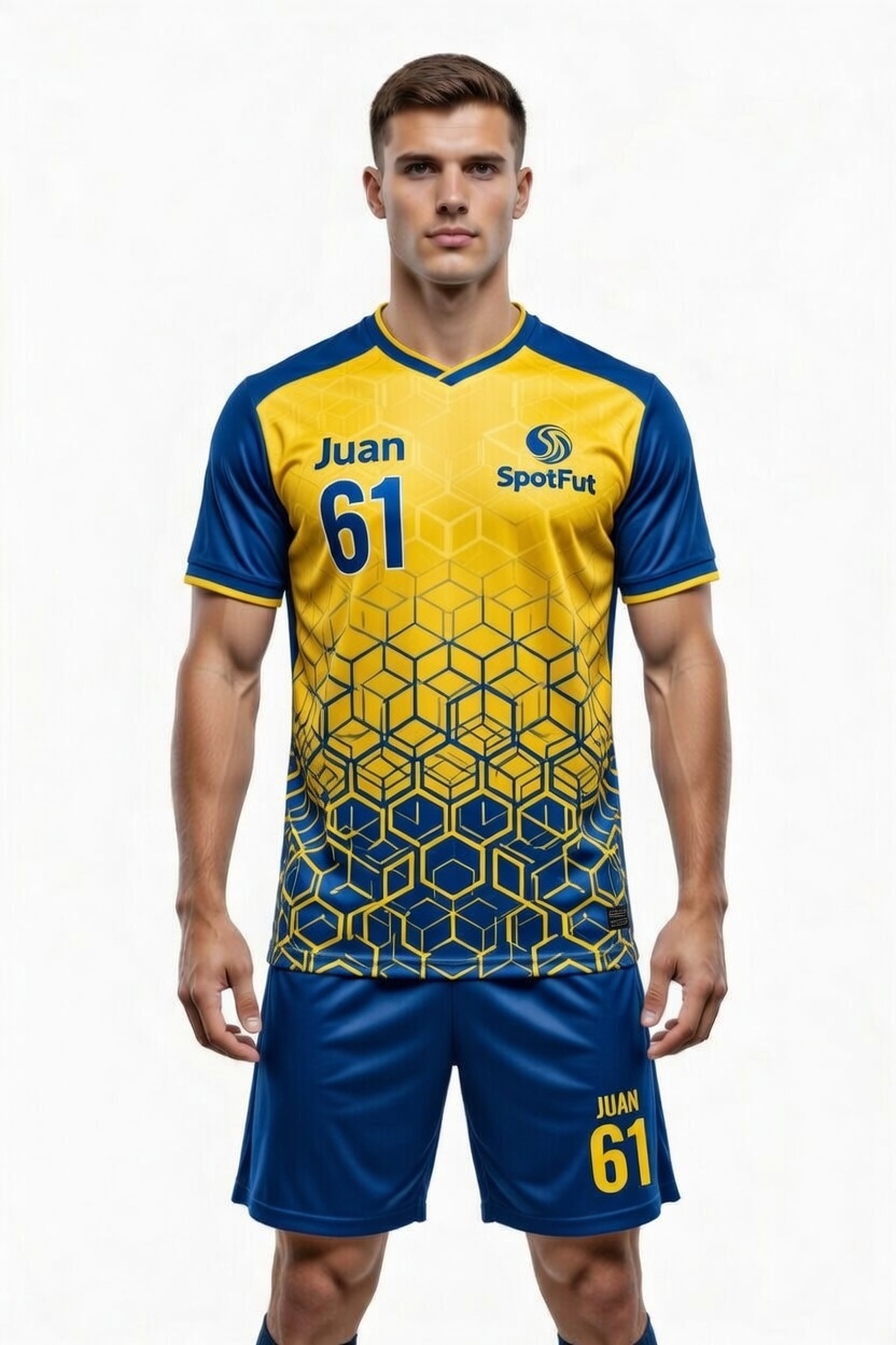 Striking yellow-blue kit featuring a sophisticated honeycomb geometric gradient.